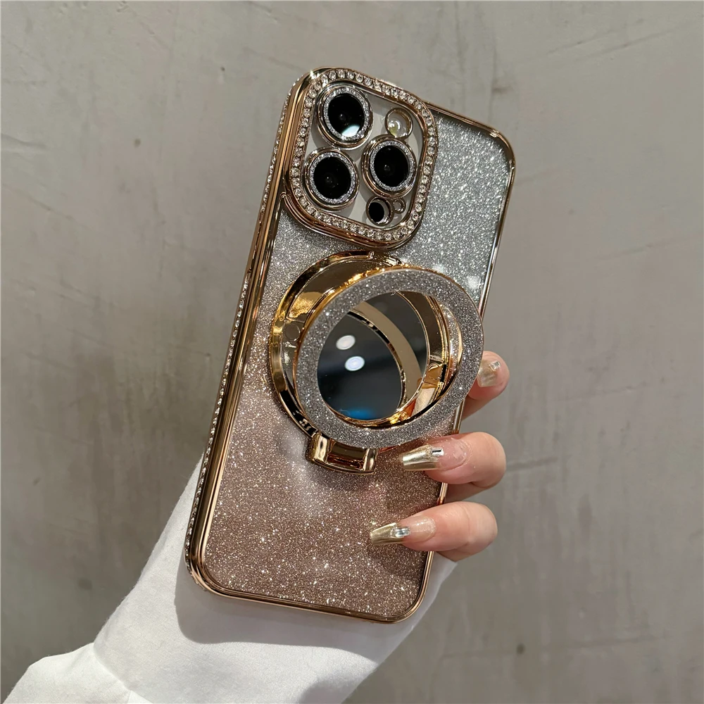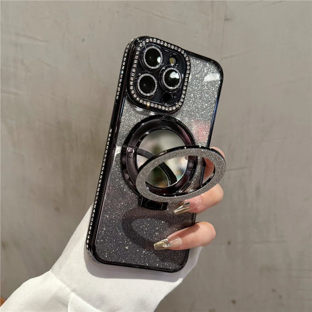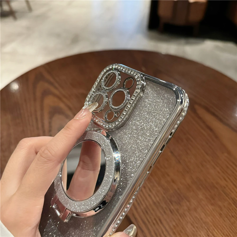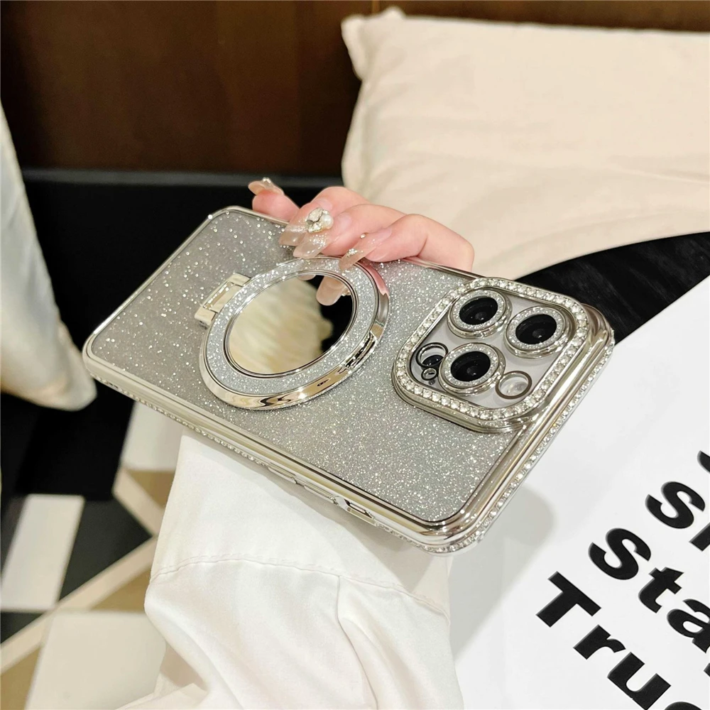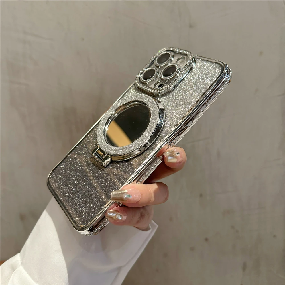 Luxury electroplated sparkling mirror holder with diamond frame suitable for iPhone