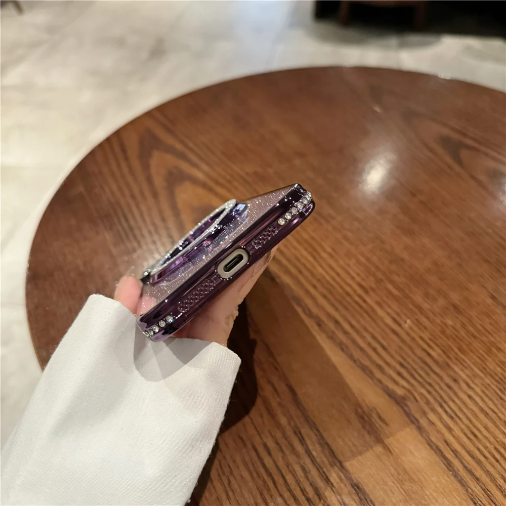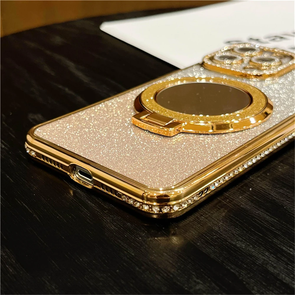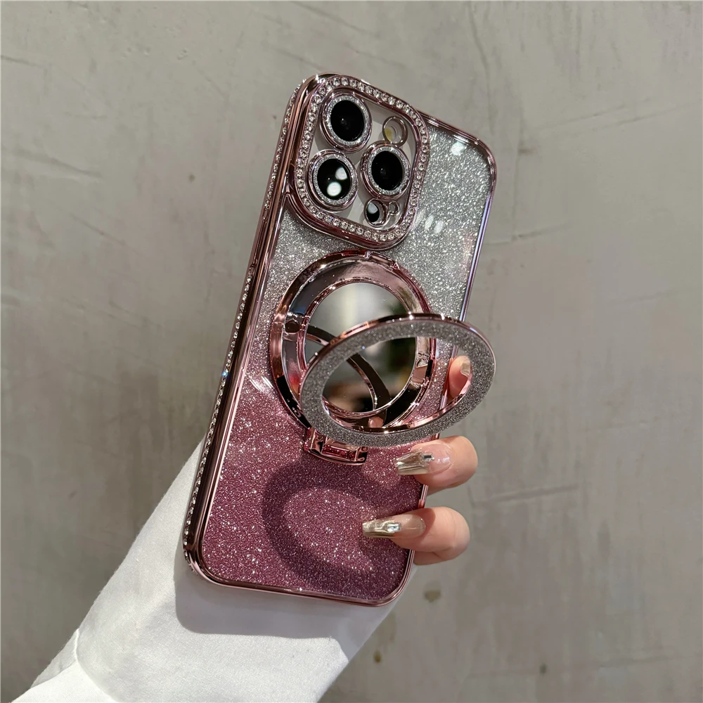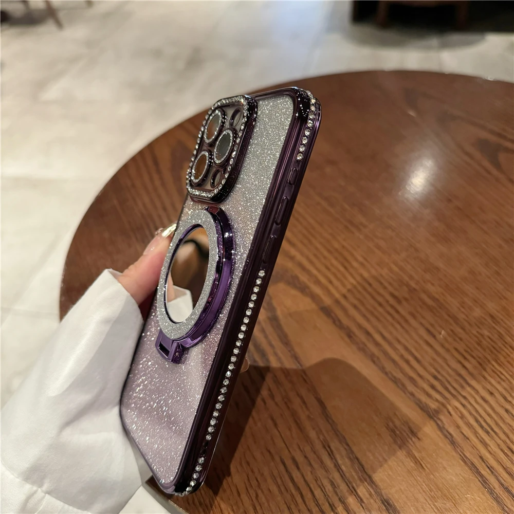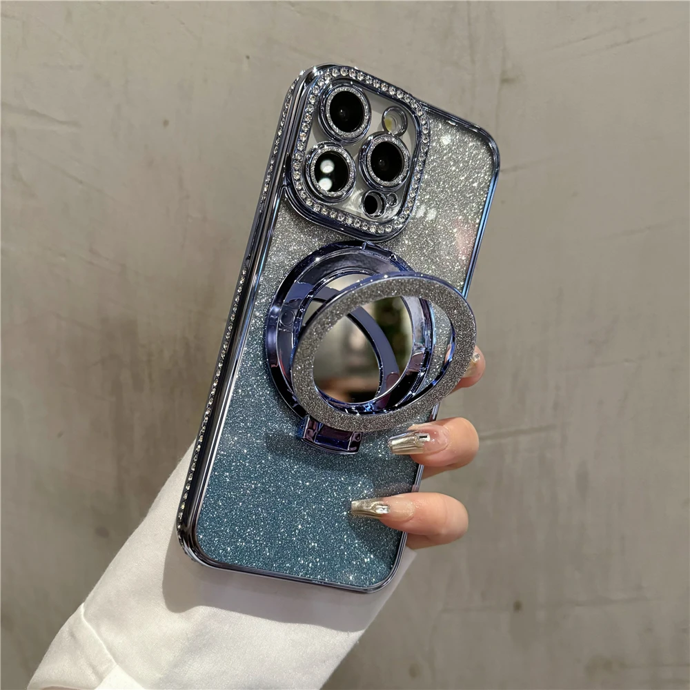Luxury electroplated sparkling mirror holder with diamond frame suitable for iPhone